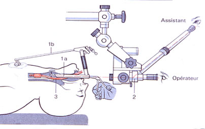 L’instrumentation comporte une suspension qui libère les mains de l’opérateur. Le laryngoscope est introduit par la bouche et s’appuie sur les dents par l’intermédiaire d’une protection dentaire. Les instruments sont utilisés sous contrôle du microscope opératoire ou des optiques. Un repos vocal post opératoire vous sera dans certains cas préconisé.