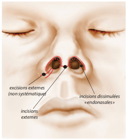 Les incisions sont réalisées à l’intérieur des narines mais souvent également sous la columelle (partie fine du nez située entre les deux narines). Cette dernière incision que l’on appelle voie externe est maintenant très popularisée aux USA mais aussi en Europe. Elle permet une meilleure exposition et donc un travail plus précis sur les cartilages de la pointe du nez et laisse une cicatrice columellaire de 5 millimètres pratiquement invisible d’autant qu’elle est située dans une zone d’ombre.