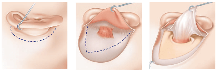 L’intervention nécessite habituellement un abord cutané qui laissera une cicatrice devant ou derrière l’oreille, le plus souvent peu ou pas visible.